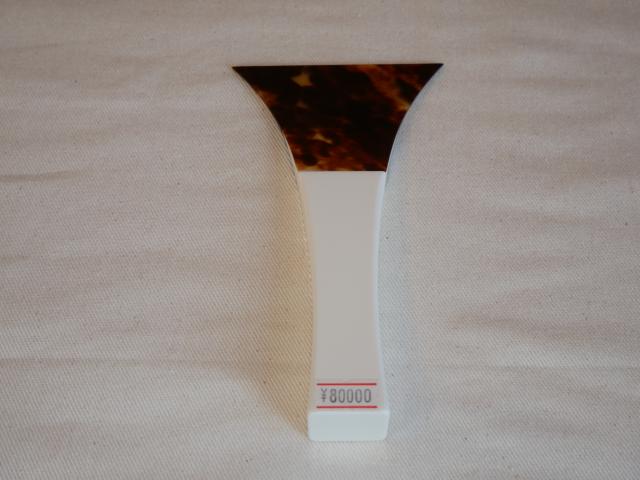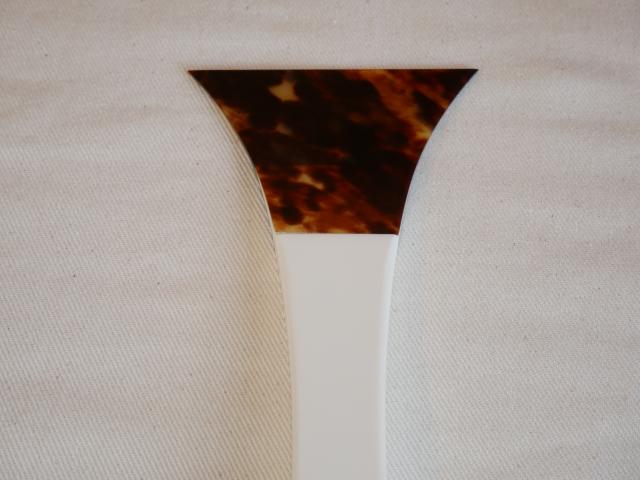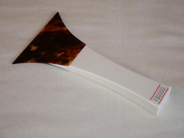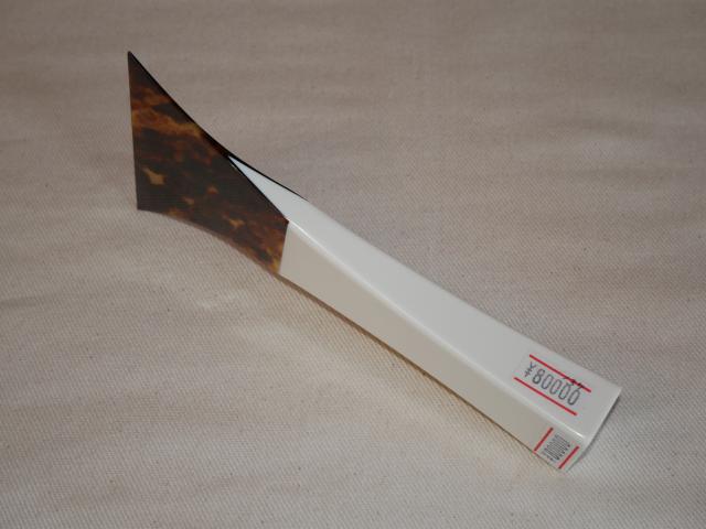 新品。かなり小さいプラ台津軽べっ甲撥です。手元も細く面取りをしてありますので手の小さい方にお勧めです。撥先のしなりは普通でややしなります。 |