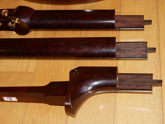 「中古三味線は全て完全修理済です」の修理内容は、胴磨き直し(留がずれていれば胴付直し)をして糸巻金具、東さわり、上駒、りんどうの金具関係を全てはずし、棹つなぎ直しのあと棹全体の表面を削り砥石で磨きます。