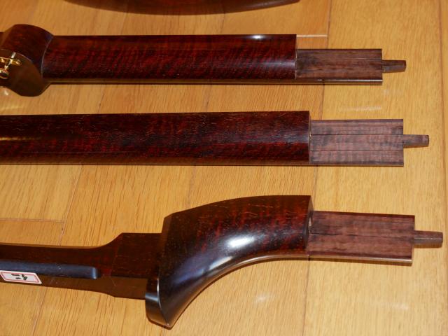 「中古三味線は全て完全修理済です」の修理内容は、胴磨き直し(留がずれていれば胴付直し)をして糸巻金具、東さわり、上駒、りんどうの金具関係を全てはずし、棹つなぎ直しのあと棹全体の表面を削り砥石で磨きます。