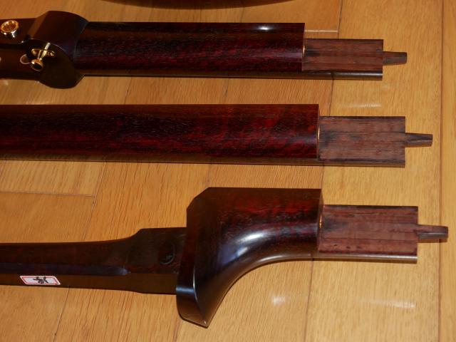 「中古三味線は全て完全修理済です」の修理内容は、胴磨き直し(留がずれていれば胴付直し)をして糸巻金具、東さわり、上駒、りんどうの金具関係を全てはずし、棹つなぎ直しのあと棹全体の表面を削り砥石で磨きます。