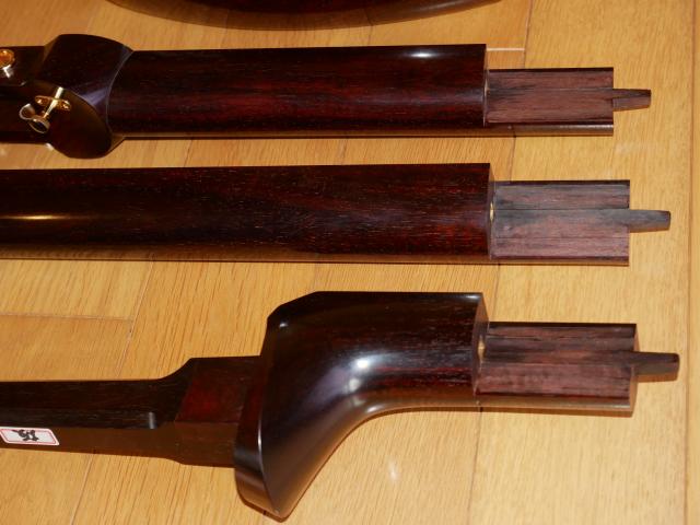 「中古三味線は全て完全修理済です」の修理内容は、胴磨き直し(留がずれていれば胴付直し)をして糸巻金具、東さわり、上駒、りんどうの金具関係を全てはずし、棹つなぎ直しのあと棹全体の表面を削り砥石で磨きます。