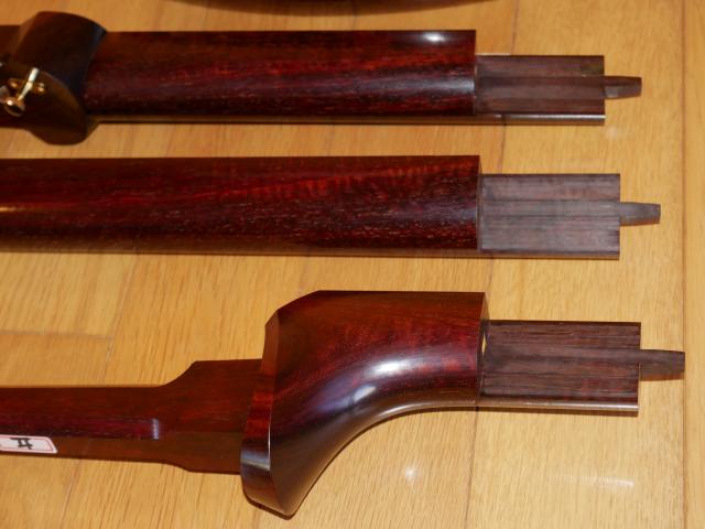 「中古三味線は全て完全修理済です」の修理内容は、胴磨き直し(留がずれていれば胴付直し)をして糸巻金具、東さわり、上駒、りんどうの金具関係を全てはずし、棹つなぎ直しのあと棹全体の表面を削り砥石で磨きます。